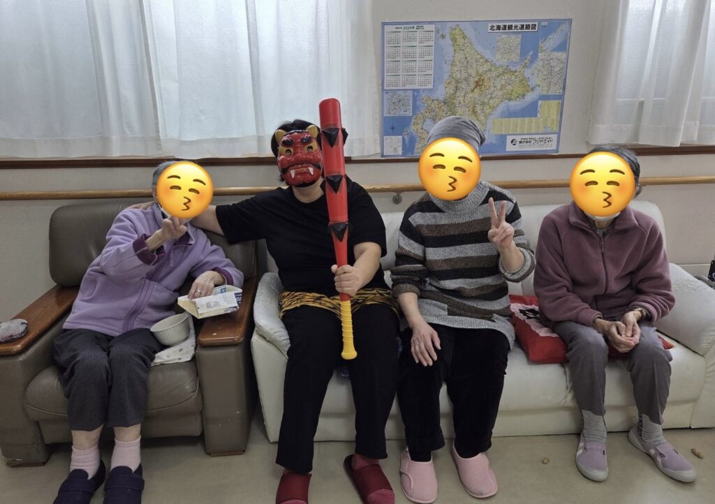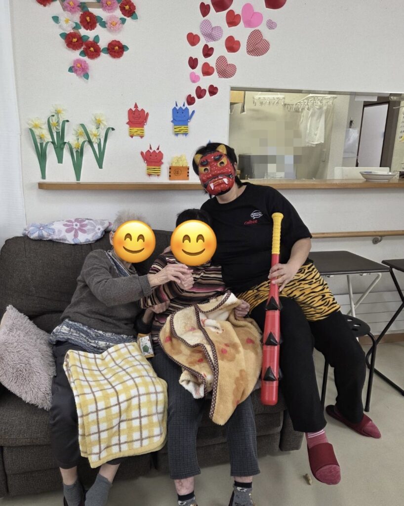 節分の日に利用者様全員で鬼に扮した職員に豆まきをしました。
